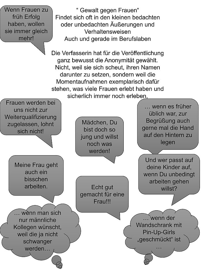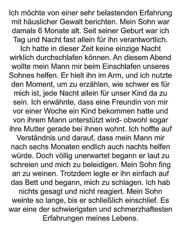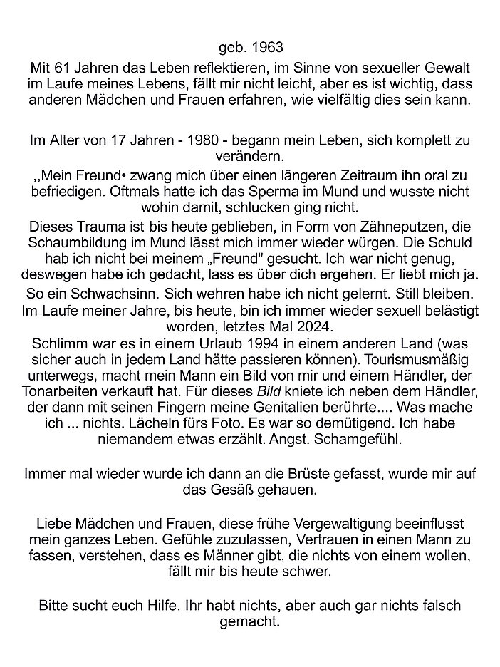 Nachfolgend finden sich alle Texte und Bilder aus der Ausstellung, die anlässlich der Orange Days 2025 zuerst im Forum des Werler Ursulinen Gymnasiums gezeigt wurden. An dieser Stelle möchten die Werler Soroptimistinnen sich noch einmal bei allen Frauen und Mädchen bedanken, die den Mut hatten, ihre Geschichte mit anderen Menschen zu teilen. In der Ausstellung wurden Inhalte, die möglicherweise zu heftigeren Reaktionen bei den Betrachtern führen könnten, besonders gekennzeichnet (Fotos mit orangefarbenen Händen) und die Stellwände so positioniert, dass ein zufälliger Blick darauf ausgeschlossen war.